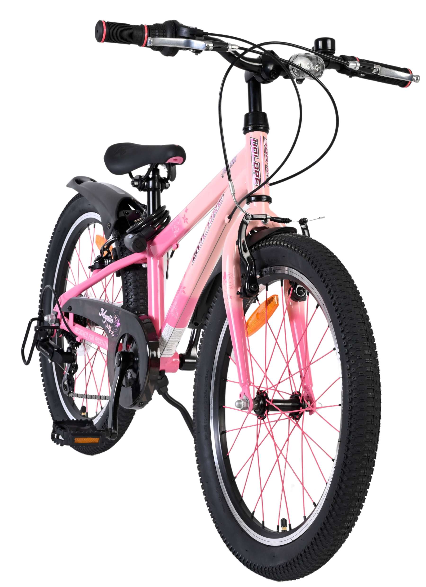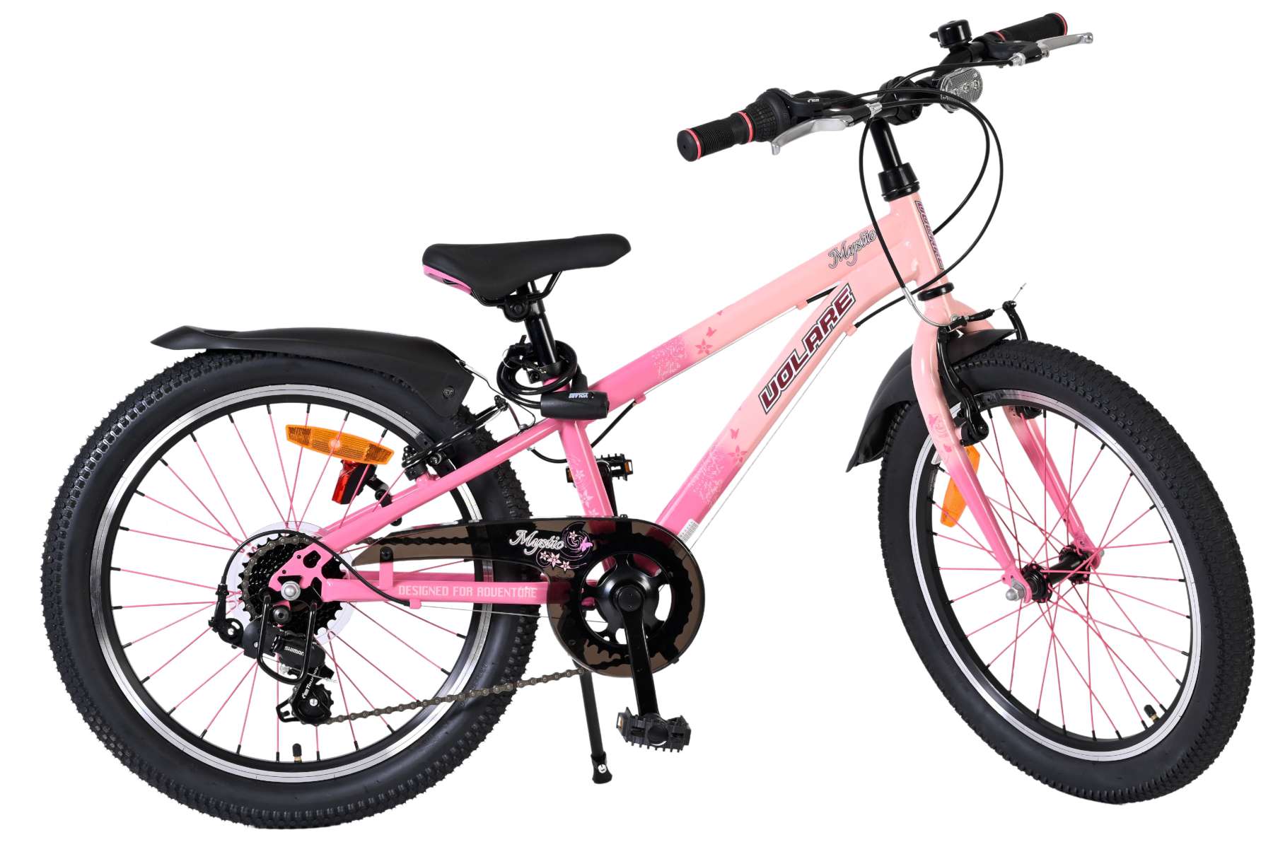 Voor goede zichtbaarheid is de Volare Mystic uitgerust met verlichting aan de voor- en achterkant, aangevuld met reflectoren in de wielen. Het sportieve karakter van de fiets wordt extra benadrukt door de opvallende roze spaken, die zorgen voor een unieke uitstraling. Daarnaast beschikt de fiets over een slot en een bel, zodat je kind veilig en goed voorbereid op pad kan.