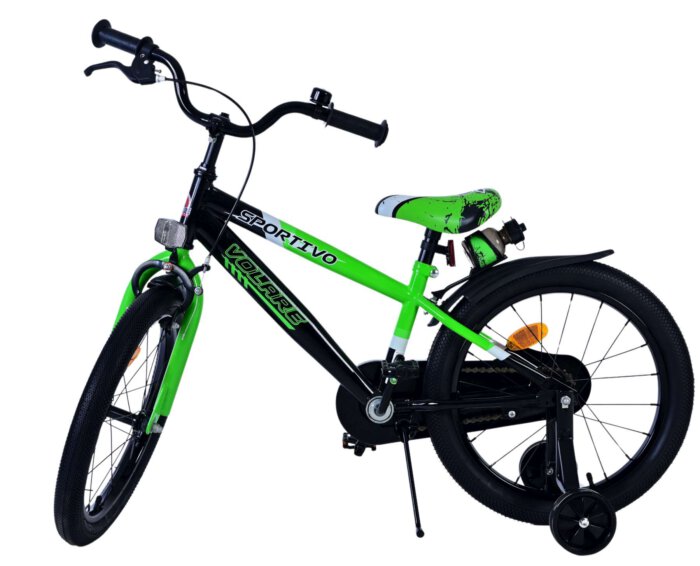 Veiligheid staat voorop! Het sterke stalen frame heeft met de stoere groen/zwarte kleurstelling een zeer sportieve uitstraling. Met de bidon in de praktische bidonhouder heeft uw kind altijd iets te drinken bij zich. De spatborden houden al het opspattend vuil tegen. Om vaart te minderen heeft de fiets zowel een hand- als terugtraprem. Ter bescherming van de kleine vingertjes is de kettingkast gesloten. De fiets heeft zijwielen en een stevige standaard.