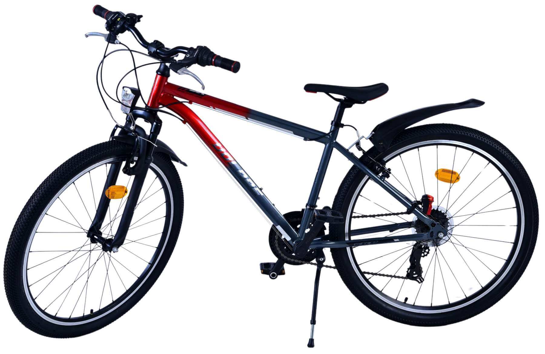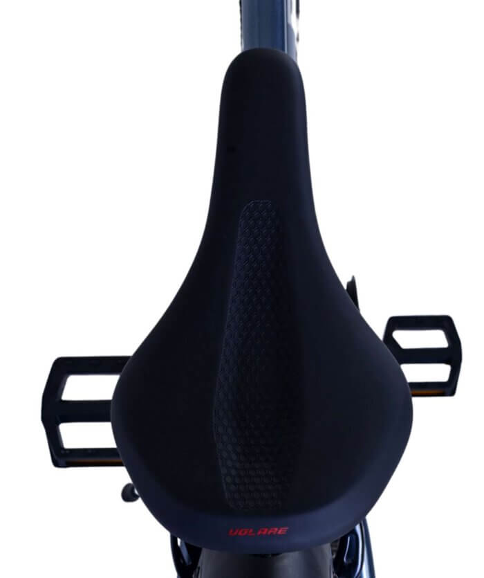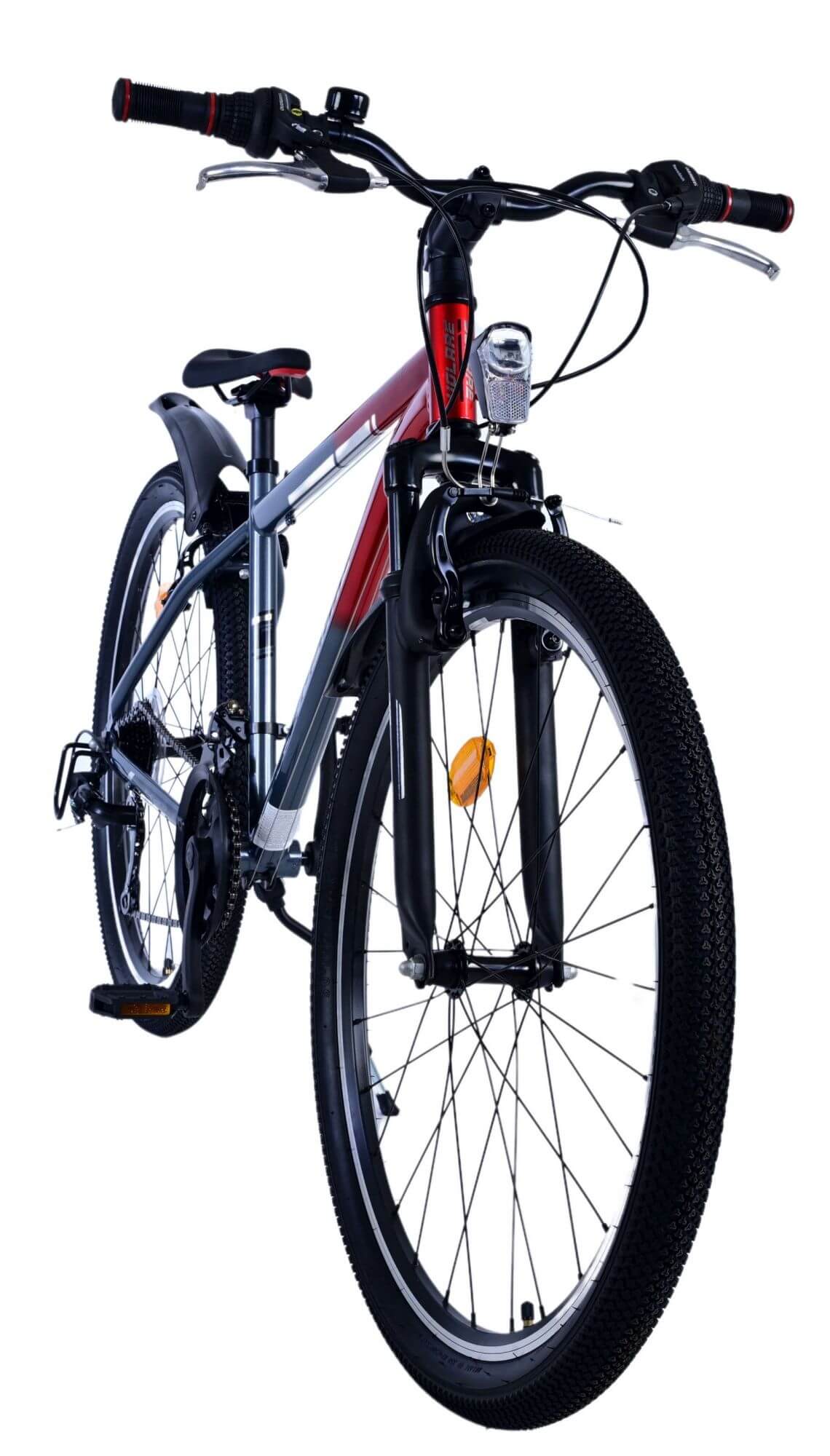 Veiligheid staat voorop! Daarom heeft deze gave fiets 2 handremmen en geen terugtraprem! Daarnaast heeft de fiets 21 versnellingen van shimano met revoshifters, reflectoren in de wielen, reflectoren voor en achter op de fiets, een bel, verlichting op batterijen voor en achter. De gekantelde stuurpen zorgt voor een beter zicht op de weg, maar is daardoor niet in hoogte verstelbaar. Ook aan het comfort is gedacht. De mooie satijn grijze Volare fiets met rode accenten heeft een comfortabel zacht zadel, een standaard zodat je fiets netjes blijft staan, en stoere extra brede banden. Om zo lang mogelijk van de fiets te kunnen genieten heeft de fiets een extra lange zadelpen waardoor de fiets nóg langer meegroeit.